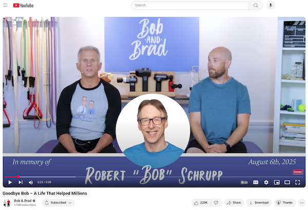 Of course I don’t know these two, but I appreciate their friendly approach to educate their followers. They have made an impressive business from their YouTube channel that started on a whim, with Bob suggesting to Brad that they give it a try, as mentioned in the memorial video. They have many products available via Amazon. I have one of their branded neck massagers that works as good as any and I enjoyed using through a tough recovery with a shoulder issue.